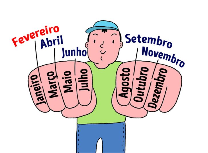Os meses com 31 dias estão nos dedos, nomeadamente: janeiro, março, maio, julho, agosto, outubro e dezembro. Os meses com 30 dias estão nos nós: fevereiro (com 28/29 dias), abril, julho, setembro e novembro.